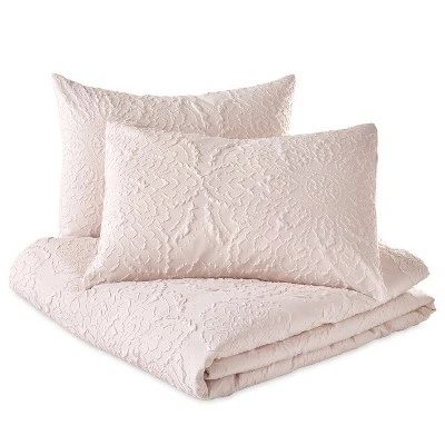 Enhance your bedroom with the elegant Solid Medallion Miscrosculpt Comforter set. The no fuss medallion sculpted texture is not only elegant but also super cozy. Available in blush and gray. Machine washable for easy care. Twin comforter set includes: one comforter, one sham. Full/Queen comforter set includes: one comforter, two shams. King comforter set includes: one comforter, two shams.