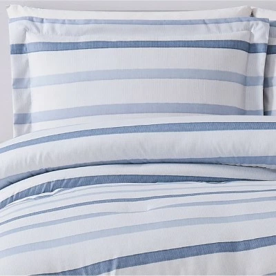 A clean and casual horizontal stripe is the focus for this bed. The printed texture emulates a yarn dyed look for added depth. The pattern is dominated by blue and gray shades on a white background. Items feature Truly Soft face and back material with for softness and performance you can count on. Bedding items reverse to a solid blue shade. All items are machine washable. The fabric is 100% brushed microfiber with our special Truly Soft treatment. Comforters are filled with 100% polyester fiber filling. This item is machine washable, but please be sure to use appropriate sized machinery to avoid any excess wear on the items.