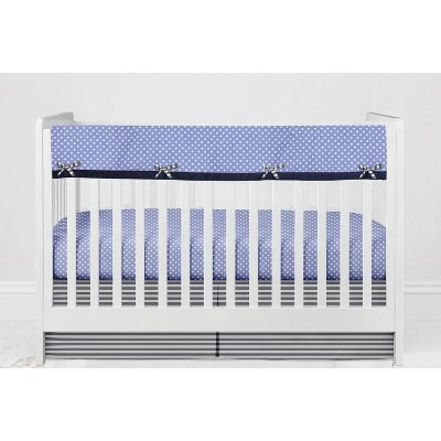 - This Bacati 6-piece Crib Set Includes Reversible Comforter/Playmat (33 x 43 inches), Crib fitted sheet (52 x 28 x 6 inches), Crib Skirt/Dust ruffle (13 inch drop) Diaper Stacker (holds more than 30 newborn diapers), Reversible Long Crib Rail Guard Cover (52 x 12 inches) and Window Valance (15 h x 56 w inches with 1.75 inch Rod Pocket) in fun, colorful and signature prints in 100 percent cotton 200 Thread Count percale fabrics. Designed in United States by Experienced Designers. Many coordinating items available to purchase separately in this Bacati Elephants Blue/Navy/Gray Bedding Collection.
