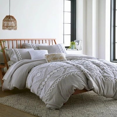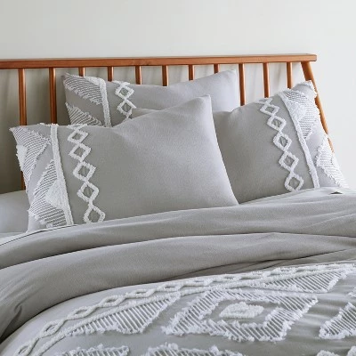 The Harleson Duvet Cover Set by Levtex Home is hip, dimensional and contemporary.ย Offered in white and grey, this design will immediately transform your bedroom.ย Made with the softest lightweight cotton, this duvet cover set features a an intricate tribal jacquard in white tufted chenille and frayed cotton on a grey cotton ground. It has a tufted and frayed white tribal pattern on grey on the front and a solid grey 100% cotton on the reverse.ย It closes with easy to use, durable buttons. The Harleson Duvet Cover Set is machine washable and includes the duvet and matching pillow cases. Enjoy this for years to come!