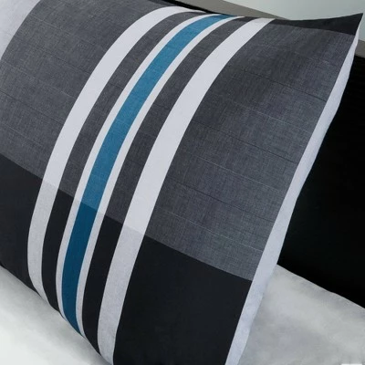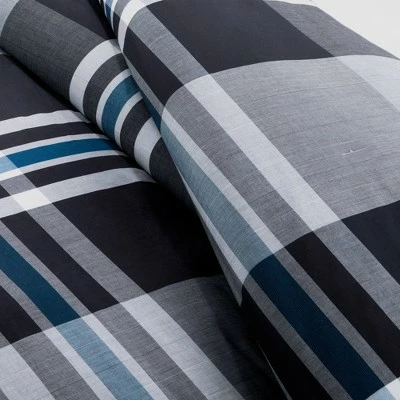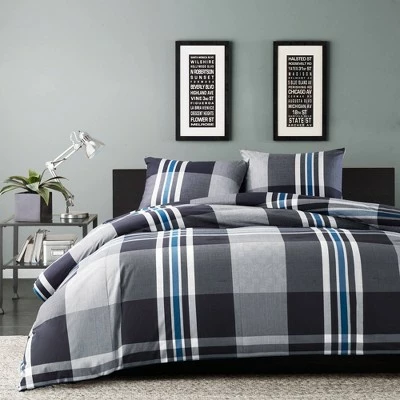 Add just a touch of color to your bedroom with the Nathan Comforter Mini Set. The bold print uses black, white and a pop of blue thread that are woven together to create a dark gray and light gray plaid pattern that is mimicked again on the sham. The Collection offers a unique comforter finishing technique that offers a clean, duvet-like finish with no bar tacks on the top of the comforter. This unique design will give your space a modern feel instantly.