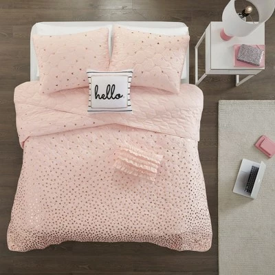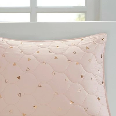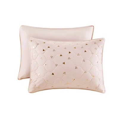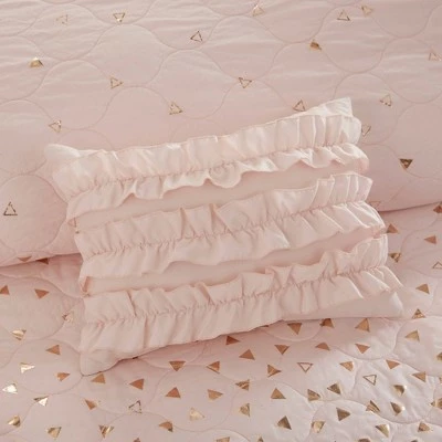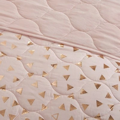 Brighten up your restful retreat or guest bedroom with the Nova Metallic Printed Coverlet Set. Soft and shiny, this four-piece bedding set is made of 100% microfiber fabric, which is soft and comfy against your skin, and it has a quilted pattern decorated with a metallic triangle overlay for a pop of shine. The set includes one coverlet, a sham and two decorative pillows that you can toss on the bed to complete the look. This bedding set provides the perfect balance of color, shine and comfort, making it ideal for creating an eye-catching focal point in your space.