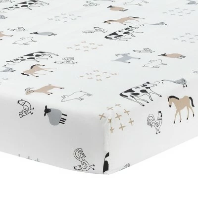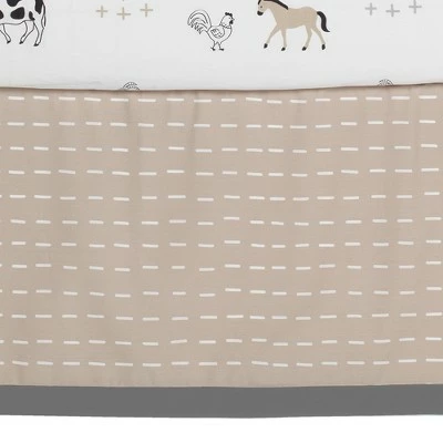The Baby Farm 5-piece nursery baby bedding crib set includes a crib quilt, 2 fitted crib sheets, crib skirt, and a full set of wall decals. This classic Baby Farm patchwork quilt includes two appliqued furry sheep, a black and white cow made in soft velour with appliqued details, a taupe color suede horse with a black velour mane, white clouds, two gray minky birds, and two appliqued trees. The base fabric is a linen rayon blend. There are two breathable 100% cotton fitted crib sheets included in this set. One is a directional print featuring sheep, cows, ducks, roosters, horses, pigs, and goats. The second sheet is a gray and white geo dot print. The crib skirt gives the finishing touch to your child’s crib. It is a cotton poly blend in taupe with white dashes. It has a gray border and a 14 ½” drop. A complete set of wall decals are included in this bedding set. There are 21 dye-cut pieces which include a black and white cow, a taupe horse, a gray sheep and duck, a taupe color pig, and trees. These are easy to apply and work best on smooth walls.