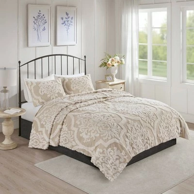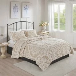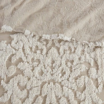 The 3pc Eugenia Tufted Cotton Chenille Damask Coverlet Set offers the perfect touch of elegance to your bedroom dΓ©cor. All over damask chenille design is beautifully displayed on the 100% cotton white coverlet, while matching shams complement the top of the bed for stunning blend of shabby chic and traditional styles. Machine washable for easy care, this cotton chenille coverlet set brings true beauty and grace to your bedroom. Due to the nature of the chenille fabric, some shedding will occur naturally in the first 3-4 washes.