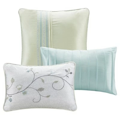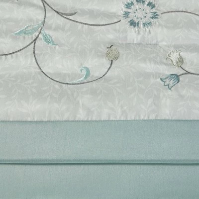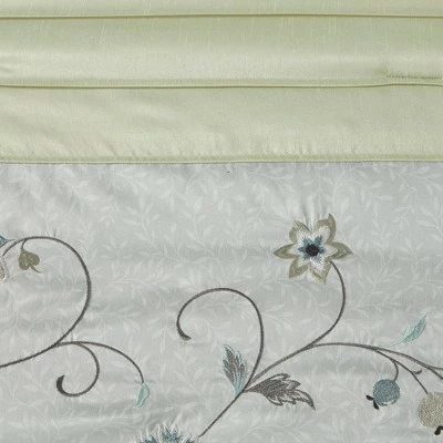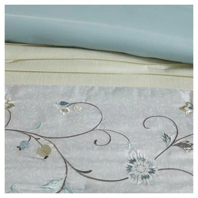 Elegantly update your bedroom with the 7pc Monroe Embroidered Comforter Set. A beautifully embroidered floral pattern is showcased on the faux silk comforter. The pieced design adds a lovely contrast and texture to the ensemble. The solid reverse complements the enticing design seen on the top of the comforter and continues gracefully down to the bed skirt. Matching shams bring the unique style of the comforter to the head of the bed, giving it a truly luxurious look. Three decorative pillows with intricate embroidery, pleating, and piecing, complete this exquisite comforter set.