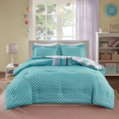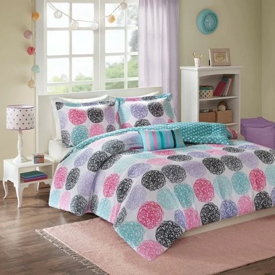 Add color to your bedroom with the Brittany Reversible Comforter Set. Doodled circles create this look with pops of pink, teal, purple and black while a teal polka dot reverse plays up the back. One fun decorative pillow uses stripes of twill tape to showcase all the major colors from the top of bed.