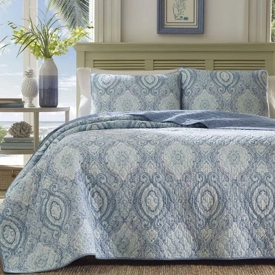 Our Tommy Bahama Turtle Cove quilt in aqua is inspired by a tropical vacation. The Tommy Bahama Turtle Cove quilt in aqua features a aqua and blue patterned design printed on an aqua ground with a solid aqua reverse. This quilt is 100% cotton, with a cotton (80%)/polyester (20%) filling, lightweight and easy to layer. The shams feature a two piece back closure. The corners of the quilt are rounded to match the sham, both edges are finished with a fabric binding. This quilt set is fully reversible. We have reduced our packaging, eliminating all plastic. Your quilt set will arrive secured with a ribbon. The set includes 1 quilt and 2 shams (1 sham for the twin set). Machine washable, for easy care.