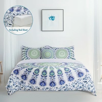 What is Bohemian Style?Bohemian style refers to a style of clothing that retains the characteristics of a certain nomadic people, which is characterized by bright handmade decorations and rough and heavy fabrics.Bohemian style represents an unprecedented romanticization, folklore, and liberalization. It also represents an artist temperament, a fashion trend, and an anti-traditional lifestyle. Features: 1.Unlike cheap polyester fabrics, we choose Polyester Microfiber , which is softer and not fade, and has a longer service life. 2.Address all your bedding needsββ4/5 Piece bedding set include 1 duvet cover+1 fitted sheet+1/2 pillowcase+1 throw pillowcase. 3.Quilt Set are designed with zipper closure and concealed rope to keep the duvet fixed in place. 4.Color: Black, Purple, Navy Blue, White and Black, Red, Light Blue, White and GreenAbout Size(No Comforter & Pillow Insert Included) 1. TWIN SIZE–Duvet cover:90″x68″, Fitted Sheet:74″x38″(13″deep), Pillowcase: 20″x27″(1pc), Throw Pillow Case:18″x18″ 2. QUEEN SIZE–Duvet cover:90″x90″, Fitted Sheet:79″x60″(13″deep),Pillowcase:20″x 27″(2pc), Throw Pillow Case:18″x18″ 3. KING SIZE–Duvet cover:102″x90″,Fitted Sheet:79″x 77″(13″deep),Pillowcase:20″x 35″(2pc), Throw Pillow Case:18″x18″Nice tips: 1. To protect the sheet, please turn the inside out when you wash the bedding set. 2. Soaking time should not to be too long and tumble dry on low.