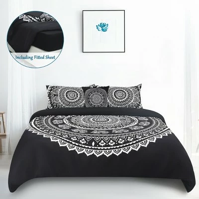What is Bohemian Style?Bohemian style refers to a style of clothing that retains the characteristics of a certain nomadic people, which is characterized by bright handmade decorations and rough and heavy fabrics.Bohemian style represents an unprecedented romanticization, folklore, and liberalization. It also represents an artist temperament, a fashion trend, and an anti-traditional lifestyle. Features: 1.Unlike cheap polyester fabrics, we choose Polyester Microfiber , which is softer and not fade, and has a longer service life. 2.Address all your bedding needsββ4/5 Piece bedding set include 1 duvet cover+1 fitted sheet+1/2 pillowcase+1 throw pillowcase. 3.Quilt Set are designed with zipper closure and concealed rope to keep the duvet fixed in place. 4.Color: Black, Purple, Navy Blue, White and Black, Red, Light Blue, White and GreenAbout Size(No Comforter & Pillow Insert Included) 1. TWIN SIZE–Duvet cover:90″x68″, Fitted Sheet:74″x38″(13″deep), Pillowcase: 20″x27″(1pc), Throw Pillow Case:18″x18″ 2. QUEEN SIZE–Duvet cover:90″x90″, Fitted Sheet:79″x60″(13″deep),Pillowcase:20″x 27″(2pc), Throw Pillow Case:18″x18″ 3. KING SIZE–Duvet cover:102″x90″,Fitted Sheet:79″x 77″(13″deep),Pillowcase:20″x 35″(2pc), Throw Pillow Case:18″x18″Nice tips: 1. To protect the sheet, please turn the inside out when you wash the bedding set. 2. Soaking time should not to be too long and tumble dry on low.