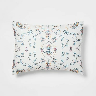 Create a refreshing, restful retreat in your bedroom with the Ancora Border Print Comforter Bedding Set from Threshold™. The stylish comforter is adorned with a pattern of paintbrush florals in blue, pink and yellow shades on a textured white background for an inviting accent to brighten up your room. A square and a rectangular decorative pillow with an embroidered or solid white design, as well as one or two matching pillow shams, coordinate with the top of the bed for a cohesive look. This bedding set is made from a lightweight fabric for soft, cozy comfort, and both the comforter and sham are machine-washable for easy cleaning. Pair it with cream bedsheets to enhance the clean, sophisticated look, and toss on throw pillows in coordinating colors to finish a lovely sleeping setting.