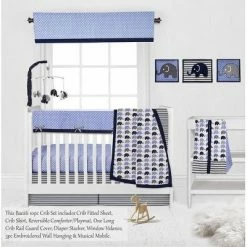 - This Bacati 10-piece Crib Set Includes Reversible Comforter/Playmat (33 x 43 inches), Crib fitted sheet (52 x 28 x 6 inches), Crib Skirt/Dust ruffle (13 inch drop) Diaper Stacker (holds more than 30 newborn diapers), Reversible Long Crib Rail Guard Cover (52 x 12 inches), Window Valance (15 h x 56 w inches with 1.75 inch Rod Pocket), 3 pc Wall Hangings Set and Musical Mobile in fun, colorful and signature prints in 100 percent cotton 200 Thread Count percale fabrics. Designed in United States by Experienced Designers. Many coordinating items available to purchase separately in this Bacati Elephants Blue/Navy/Gray Bedding Collection.