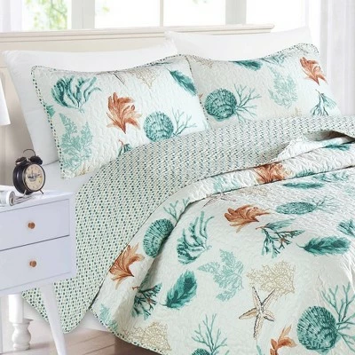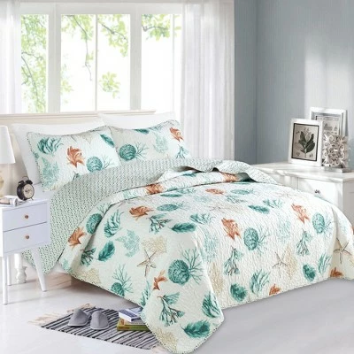 Drift off to sleep with the sound of waves crashing in your imagination thanks to the Coastal Collection 3-Piece Quilt Set. This multi-colored quilt- and-shams ensemble features seascape imagery that can have you feeling like your bedroom is a 5-star hotel in the Florida Keys. Since itβs made from a cotton/poly fill blend, the quilt makes a perfect cover nearly any night of the year. Itβs super easy to care for, too. Machine wash and toss it back on the bed.