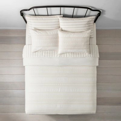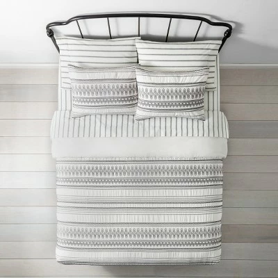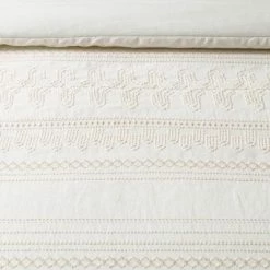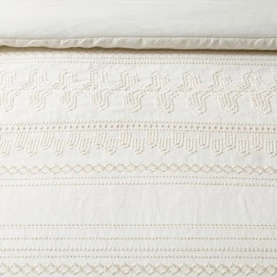 Update your master bedroom or guest room with a warm, welcoming look when you dress the bed with the Embroidered Comforter & Sham Set from Hearth & Hand™ with Magnolia. This sweet and stylish bedding set includes a comforter and one or two pillow shams, with each piece featuring beautiful embroidered details for a lovely textured look. Small dot, diamond and floral-like motifs are arranged in rows for a neat, stripe-like effect, providing a crafted handmade look that will instantly elevate the entire room. The linen-cotton blend fabric — with 100% cotton backing on comforter — offers a soft touch, while the comforter fill provides a midweight feel that’s suitable for use throughout the year.