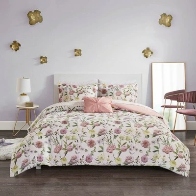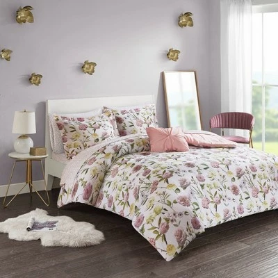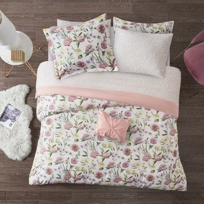 - β’ Contemporary floral comforter and sheet set that gives a vibrant update in your bedroom