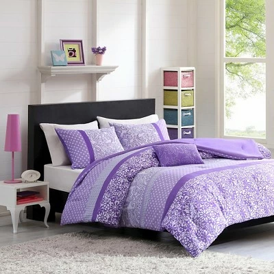 Brighten up your bedroom with the vivid charm of the Mi Zone Angela Comforter Set. The comforter features a stripe motif of polka dot, paisley, and floral prints, in purple, grey, and white colors, with a solid purple reverse, for a fashionable look. The 2 matching shams (1 in Twin/TwinXL) pair beautifully with the comforter, while an oblong decorative pillow with floral embroidery adds the finishing touch to the comforter set. This bedding set uses an antimicrobial treatment that provides built-in freshness protection, reducing the growth of odor causing bacteria to keep fabric lasting longer.