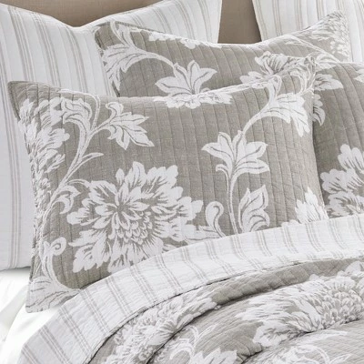 The Sanira Reversible Twin Quilt Set by Levtex Home is inspired by vintage French wall coverings. This floral design will immediately transform your bedroom. Made with the softest lightweight cotton, this reversible quilt features a beautifully rendered large scale Jacobean floral, reversing to a a classic French taupe on cream stripe on the other. The Twin Quilt Set is machine washable and includes the quilt (68x86in.) and one standard pillow sham (26x20in.) Enjoy this for years to come!