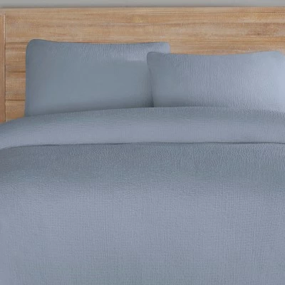 Update any dΓ©cor with the simple, casual look with a soft and cozy gauze inspired texture, Vue Elements Larking 3pc Duvet Set. Full/Queen set measures 90 in x 90 in with two 20 in x 26 in standard shams. King set measures 102 in x 90 in with two 20 in x 36 in king shams. Machine Washable.
