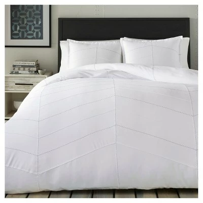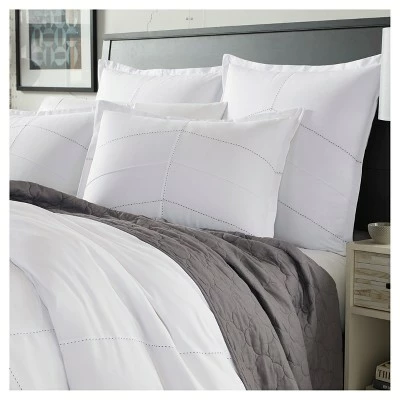 Dimensional tailoring details and a modernist sensibility combine to create a fresh, contemporary statement in pristine white cotton with gray accent stitching. Alternate rows of embroidery and pin tucking create a sculptural chevron stripe design that is both minimal and luxurious. Choose to go all white, or layer in City Sceneβs Moroccan Medallion quilt in dark gray for a dramatic accent.