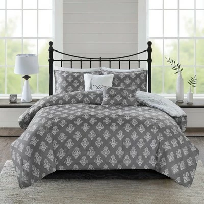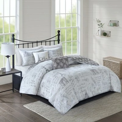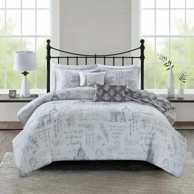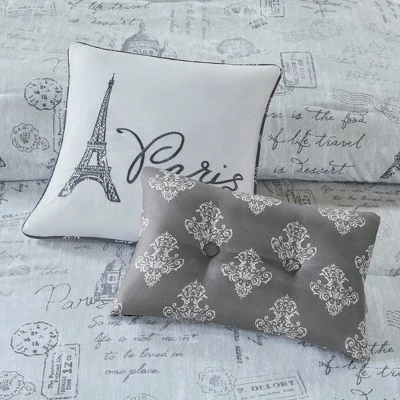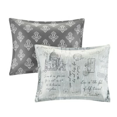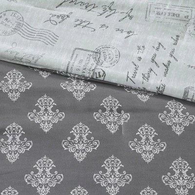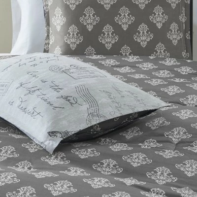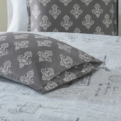 Bring your bedroom to life with the 5pc Apolline Reversible Comforter Set. The gray and charcoal reversible comforter flaunts a Paris-inspired postage print on the face that flips to an all-over damask pattern on the reverse, for a charming casual look. Two matching shams reiterate the design seen on top of the comforter, while two decorative pillows provide the perfect accents. The square decorative pillow features a Parisian theme and the oblong pillow displays a damask print to complement the reversible bedding set. Made from ultra-soft microfiber with hypoallergenic filling, this reversible comforter set transforms your bedroom décor with the charm and beauty of Paris.