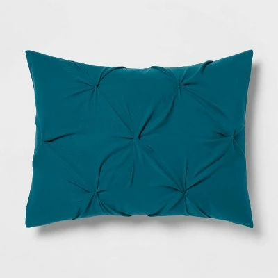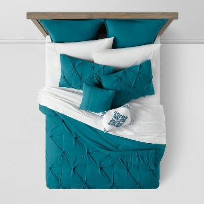 Dress up your sleep space with a hint of shabby-chic elegance with the Montvale Pinch Pleat Comforter Set from Threshold™. Simply stylish pinch pleats add texture and dimension for a look that’s brimming with timeless elegance, while the solid color options are easy to pair with a variety of different decors. Paired with a soft comforter, this bedding set includes matching pillow shams, Euro shams and decorative pillows to complete the stunning look. This machine-washable bedding set also includes a bed skirt to give any bed a tailored finish.