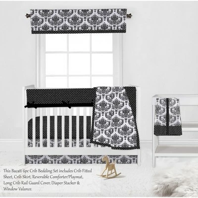 - This Bacati 6-piece Crib Set Includes Reversible Comforter/Playmat (33 x 43 inches), Crib fitted sheet (52 x 28 x 6 inches), Crib Skirt/Dust ruffle (13 inch drop) Diaper Stacker (holds more than 30 newborn diapers), Reversible Long Crib Rail Guard Cover (52 x 12 inches) and Window Valance (15 h x 56 w inches with 1.75 inch Rod Pocket) in fun, colorful and signature prints in 100 percent cotton 200 Thread Count percale fabrics. Designed in United States by Experienced Designers. Many coordinating items available to purchase separately in this Bacati Classic Damask Black/Grey/White Bedding Collection.