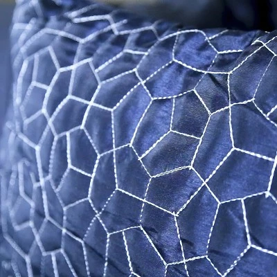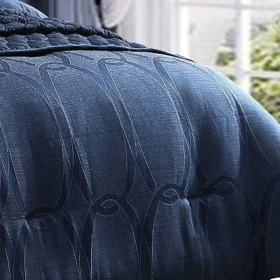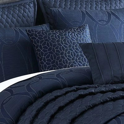 Make a big and bold statement with the Destiny 10 piece Collection from Riverbrook Home. This stunning ensemble in midnight blue features Geometric oblong intertwined shapes with layered matching quilted coverlet. The accent pillows and shams add interest and whimsy to this sophisticated contemporary design. Set includes comforter, coverlet, 4 shams, bedskirt and 3 decorative pillows. Machine washable for easy care.