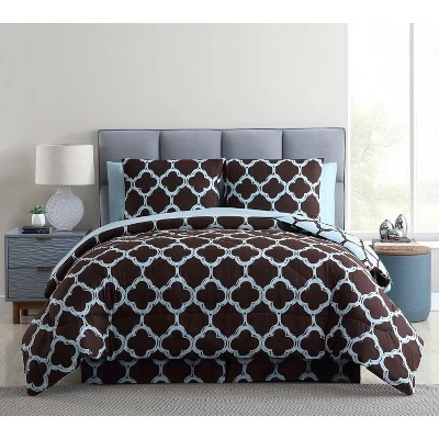 Add a bold pop of pattern with the VCNY Home Galaxy Reversible Quatrefoil Bed-in-a-Bag Comforter Se, featuring two sides of eye-catching quatrefoil designs in contrasting colors. Made of soft microfiber, the 6 or 8-piece set includes a comforter, bedskirt, shams (one sham in Twin set), flat sheet, fitted sheet, and pillowcases (one pillowcase in Twin set)โeverything you need to completely transform your bed.