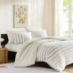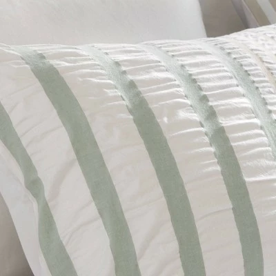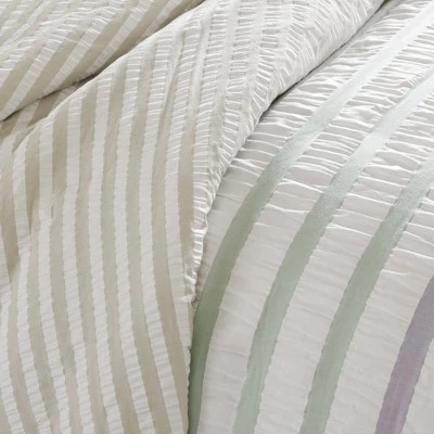 The Sutton Duvet Cover Set shows off subtle stripes in multi-color amidst a white seersucker background. The different stripe widths along with the color variations add dimension to this clean look. Made from yard dyed, 100% cotton, this set includes a duvet cover and two shams (one for Twin size).