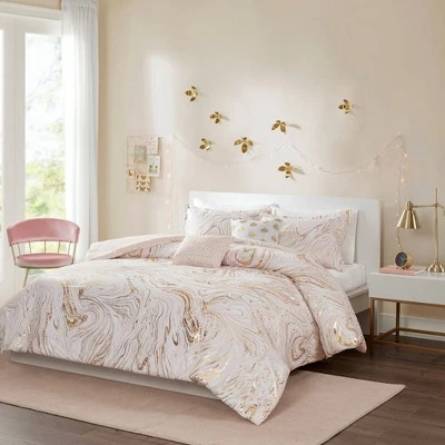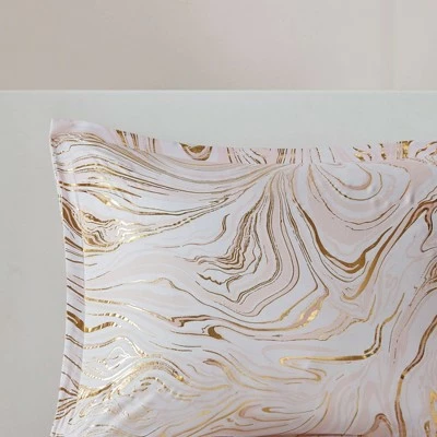 Make your bedroom shine with the Vanessa Metallic Printed Comforter Set. This extra-soft, brushed microfiber comforter flaunts a swirl marble print with metallic details, for a stunning contemporary design. A solid reverse complements the top of the bed, while matching shams (1 in Twin/TwinXL) mirror the look of the comforter. Two decorative pillows with shiny thread add the perfect finishing touches to the modern comforter set. This bedding set is OEKO-TEX certified, meaning it does not contain any harmful substances or chemicals, and uses an antimicrobial treatment that provides built-in freshness protection, reducing the growth of odor causing bacteria to keep fabric lasting longer.