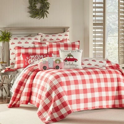 - FARMHOUSE FOR THE HOLIDAYS: One of our most popular quilt sets, Road Trip is inspired by a cozy farmhouse Christmas, with a red and white buffalo plaid on the front and a charming reverse pattern of cars piled high with all things Christmas. A bound border provides contrast and texture to complete the look.