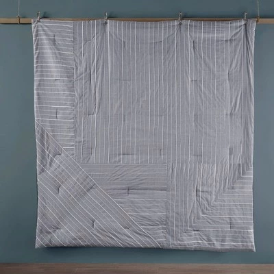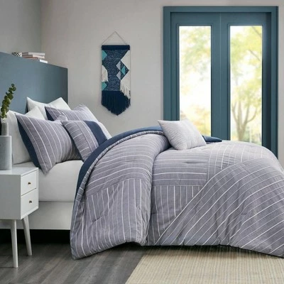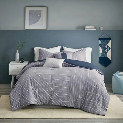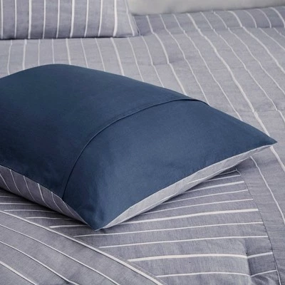 Create a modern look in your bedroom with the Bryce 5 Piece Cotton Rich Comforter Set. The cotton-rich comforter and shams feature all-over yarn dyed pleating with woven stripes on a chambray base, for a contemporary design. A square pillow and an oblong decorative pillow provide the finishing touches to the chambray comforter set. This bedding set is OEKO-TEX certified, meaning it does not contain any harmful substances or chemicals to ensure quality comfort and wellness.