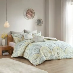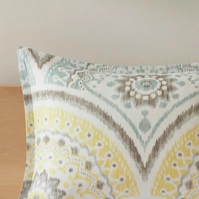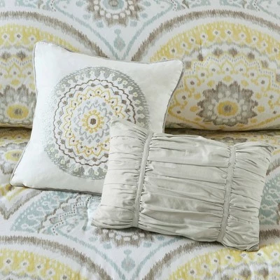 The Leyla 7 Piece Cotton Comforter Set offers a relaxing update to your bedroom. The comforter showcases an ikat printed medallion fan motif in muted shades to create a pleasant globally inspired look. Two matching shams pair perfectly with the comforter, while two quilted Euro shams add texture to the bedding set. An embroidered medallion square decorative pillow and a ruched oblong pillow provide the finishing touches. Machine washable for easy care, this bedding set is OEKO-TEX certified, meaning it does not contain any harmful substances or chemicals, ensuring quality comfort and wellness.