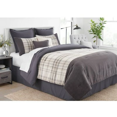 Freshen up your bedroom oasis with the timeless style of the Conway Comforter Set from Threshold™. Made from a woven fabric, this multi-piece bedding set includes everything you need to transform your bedroom into a cozy haven that provides year-round comfort — simply add your choice of sheets. The comforter is adorned with lovely plaids in white, brown and gray shades at the center, and is flanked by corduroy-like textured fabric borders to add a cozy feel to your space. The solid reverse adds elegant style, and the two matching plaid shams and two solid shams complete the plaid comforter set with a coordinated look. It also has two decorative pillows in white sherpa and dark corduroy-like fabric, as well as a solid bed skirt, to provide the perfect finishing touch to your bedscape.