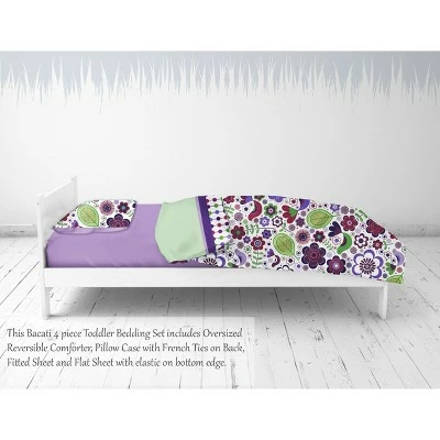 - This Bacati 4-piece Toddler Bedding Set Set Includes Reversible Oversize Comforter (42 x 55 inches), Toddler Bed Fitted Sheet(52 x 28 x 6 inches), Toddler Bed Flat Sheet(52 x 42 inches) which is fitted at the bottom to make the bed easily and Standard Pillow Case (20 x 25 inches) with french ties on the back in fun, colorful and signature prints in 100 percent cotton 200 Thread Count percale fabrics. Designed in United States by Experienced Designers. Many coordinating items available to purchase separately in this Bacati Botanical Floral Birds Purple Multicolor Bedding Collection.