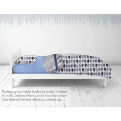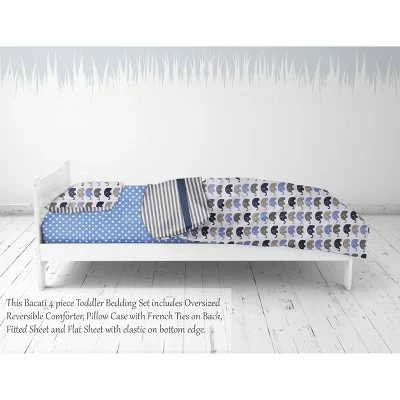 - This Bacati 4-piece Toddler Bedding Set Set Includes Reversible Oversize Comforter (42 x 55 inches), Toddler Bed Fitted Sheet(52 x 28 x 6 inches), Toddler Bed Flat Sheet(52 x 42 inches) which is fitted at the bottom to make the bed easily and Standard Pillow Case (20 x 25 inches) with french ties on the back in fun, colorful and signature prints in 100 percent cotton 200 Thread Count percale fabrics. Designed in United States by Experienced Designers. Many coordinating items available to purchase separately in this Bacati Elephants Blue Navy Gray Bedding Collection.