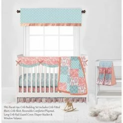 - This Bacati 6-piece Crib Set Includes Reversible Comforter/Playmat (33 x 43 inches), Crib fitted sheet (52 x 28 x 6 inches), Crib Skirt/Dust ruffle (13 inch drop) Diaper Stacker (holds more than 30 newborn diapers), Reversible Long Crib Rail Guard Cover (52 x 12 inches) and Window Valance (15 h x 56 w inches with 1.75 inch Rod Pocket) in fun, colorful and signature prints in 100 percent cotton 200 Thread Count percale fabrics. Designed in United States by Experienced Designers. Many coordinating items available to purchase separately in this Bacati Paisley Sophia Coral Aqua Bedding Collection.
