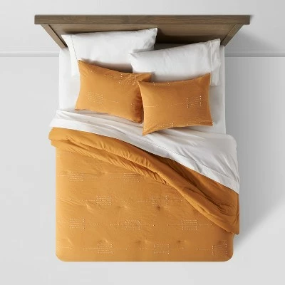 Update the look of any bedroom in your home with the Clipped Linework Comforter & Sham Set from Threshold™. This decorative comforter set includes one full/queen comforter and two standard shams, each crafted from 100% cotton to ensure you stay cozy and comfy as you take a nap or sleep through the night. Featuring a clipped linework pattern on a solid background, this comforter and sham set easily blends with your existing bedroom decor, while giving you an array of choices to decorate your sleeping nook. Simply toss on contrasting shams and pillows, and add printed percale sheets to create an inviting resting space.