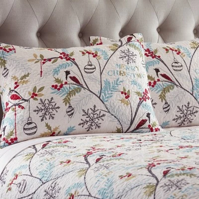 The Holly Reversible Quilt Set by Levtex Home is inspired by snowy woods on Christmas morning. Offered in teal, red, green and white, this design will immediately transform your bedroom. Made with the softest pre-washed cotton, this reversible quilt features a pattern of trees adorned with holly, birds and ornaments, reversing to a grey and red branch print on the other. The Quilt Set is machine washable and includes the quilt and pillow shams. Bring the holidays home!