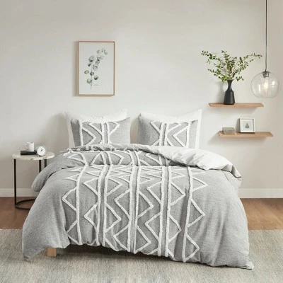 TheHayes 3 Piece Cotton Chambray Comforter Set with Chenille brings a perfect blend modern and boho styles to your bedroom. This cotton comforter features chenille taping and trims, in a geometric design, that contrast the grey chambray fabric, for a chic boho look. A solid reverse offers a light contrast to the top of the bed, while hidden bar tacks provide a clean, duvet-like finish. The 2 matching shams repeat the pattern of comforter to complete this globally inspired bedding set. Machine washable for easy care, this 100% cotton comforter set adds a sophisticated charm to your bedroom decor.