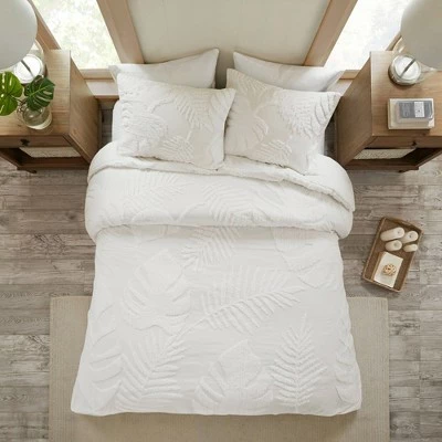 Bring a coastal charm to your bedroom with the Ceiba 3pc Tufted Cotton Chenille Palm Comforter Set. The 100% cotton chenille comforter features tufted tropical palm leaves on the face for a casual coastal allure. Matching shams mirror the design of the comforter, completing the tropical comforter set. Hypoallergenic polyester filling in the comforter provides exceptional warmth and comfort. Machine washable for easy care, this tufted cotton chenille comforter set serves as the perfect complement to a beach style bedroom decor. Due to the nature of the chenille fabric, some shedding will occur naturally in the first 3-4 washes.