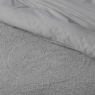 Anchor your bedroom oasis with the rich texture and timeless style of the Matelasse Medallion Comforter & Sheet Bundle from Threshold™. Made from midweight 100% cotton, this multi-piece bedding set includes everything you need to transform your bedroom into a cozy haven that provides year-round comfort. The comforter is adorned with matelasse-woven medallion texture to liven up your space with an ornate design. The matching solid back adds elegant style, and the two matching matelasse shams, two contrasting pillowcases in a solid hue, and a medallion texture decorative pillow complete the artisanal-style comforter set with a coordinated look. It also has a fitted and a flat sheet to provide the perfect finishing touch to your bedscape.