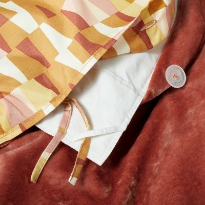 Provide your bedroom with a beautiful update with this Reversible Velvet Duvet Cover & Sham Set from Opalhouse™ designed with Jungalow™. The duvet cover features a rich, solid-hued velvet face that reverses to a bright multicolored geometric print for charming contrast, allowing you to change the look of your bedding in an instant, and the matching pillow sham completes the coordinated set. This lightweight bedding set has button closures and string ties on the duvet cover and a six-inch envelope closure on the sham for snugly securing the inserts, and both are machine-washable for easy cleaning. Pair this reversible duvet cover bedding set with white bedsheets to enhance the clean, sophisticated look, then add throw pillows in coordinating colors to accent the set.