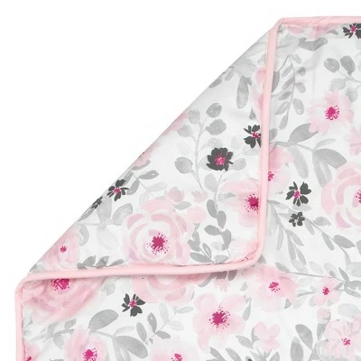 Welcome home your little girl with this charming watercolor floral 3-piece crib bedding set which includes one quilt/comforter, one crib skirt, and one floral fitted crib sheet. A gorgeous floral watercolor print decorates the quilt and fitted crib sheet in shades of pinks and grays. The solid pink crib skirt is shirred and has a 10β drop. This eco-friendly nursery collection has been digitally printed in a high-resolution microfiber which enhances the pink and gray colors. Designed to fit a standard size crib measuring 52″ x 28″.