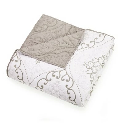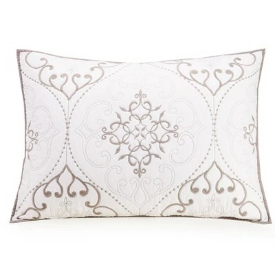 A classic quilt adding pattern and texture to your home. Solid color embroidery of intricately scrolled medallions outlined by dotted lined ogees all pop off a white ground. This set can make a complete bed or create another layer of style to your existing bed. The quilt reverses to a solid for an extra splash of color. The easy elegance of this style will make it a favorite.