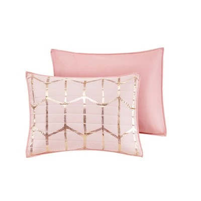 Freshen up your bedroom with the enchanting style of Arielle 6pc Metallic Printed Reversible Daybed Set. The stunning quilted daybed cover flaunts a geometric, metallic gold print against a soft blush ground for a fun and eye-catching look, while the pink reverse complements the modern print on the top of bed. A cotton-rich filling provides exceptional warmth and comfort, while the ultra-soft microfiber fabric creates a soft-hand feel. Three matching shams echo the design seen on top of the bed and a solid blush bed skirt brings the entire ensemble together. A decorative pillow with metallic details is also included to complete this glamorous daybed cover set.
