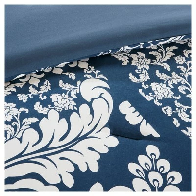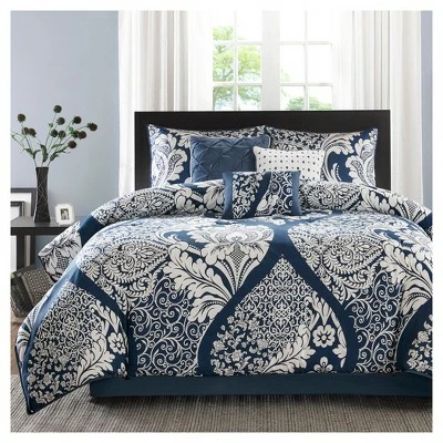 Stunningly elegant, the Adela 7pc Cotton Sateen Printed Comforter Set offers an eye-catching update to your bedroom dΓ©cor. A beautifully intricate ogee damask pattern is flaunted across the comforter for a chic transitional look. A solid reverse perfectly complements the top of the bed, while the flange border adds a charming accent to the comforter. Two coordinating shams mirror the look of the comforter and feature an added flange border accent. To complete the bedding set, three decorative pillows with embroidered details and fabric manipulation, and a solid bed skirt are included. Made from 100% cotton sateen, this comforter set is machine washable for easy care, soft to the touch with hypoallergenic filling, this comforter set adds a touch of charm to your bedroom.