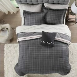 The Wade Reversible Complete Bedding Set offers a total transformation and modern update to your bedroom. Sporting a microfiber construction in earthy hues, this multi-piece bedding set includes a soft-filled comforter, shams, pillowcases, a decorative pillow, a fitted sheet and one flat sheet. The ultra-soft microfiber comforter features a striped pattern on the face with a windowpane print on the reverse, offering two classic, contemporary looks in one. The matching shams reiterate the reversible design of the comforter, while a coordinating decorative pillow with button accents provides the finishing touch.