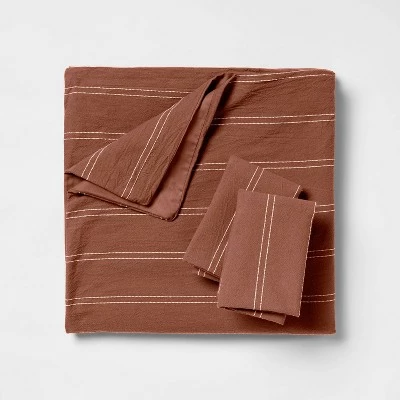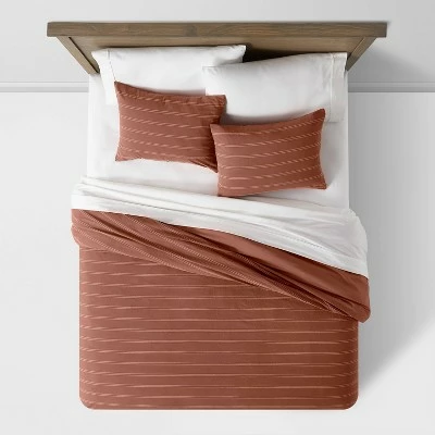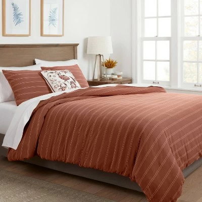 Escape into a cozy resting haven with this Simple Woven Stripe Duvet & Sham Set from Threshold™. This decorative duvet set includes one duvet cover and two standard shams, each crafted from 100% cotton to ensure you stay cozy and comfy as you take a nap or sleep through the night. Adorned with sewn chalk stripes on a woven solid background, this duvet and sham set easily blends with your existing bedroom decor, while giving you an array of choices to decorate your sleeping space. Simply coordinate with contrasting shams and pillows, and add printed percale sheets to lend a cozy feel that’s perfect for sinking into after a long day.