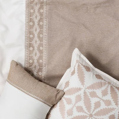 With the Hawley Comforter Set from Threshold™, you’ll be adding layer by layer of stylish texture and comfort to your sleeping haven. This multi-piece bedding set includes a queen comforter, two decorative pillows, two standard shams, two euro shams and a bed skirt. Meticulous embroidered border details on the comforter and shams enliven the atmosphere in your bedroom, while decorative pillows and a bed skirt serve as chic accents to this two-tone bedding set in beige.