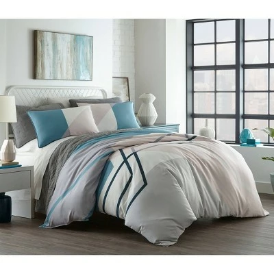 Bring modern sophistication to your bedroom décor with the City Scene Thornton Comforter Set. Intersecting lines of pastel blue and pink on a crisp white ground, add a modern touch to this digitally printed ensemble. Constructed with soft and silky microfiber, the Thornton Comforter Set reverses to solid baby blue that contrasts the abstract face. Artistic and urbane, this bed set will provide a fresh update with a contemporary attitude for any bedroom. Coordinating shams mimic the face of the comforter and feature a European closure. Ensemble is polyester filled and machine washable for easy care. Twin Comforter Set includes: One twin comforter (86″L x 68″W) and one standard sham (21″L x 27″W), Full/Queen Comforter Set includes: One full/queen Comforter (92″L x 92″W) and two standard shams (21″L x 27″W), King Comforter Set includes: One king comforter (92″L x 110″W) and two king shams (21″L x 37″W)